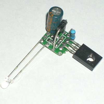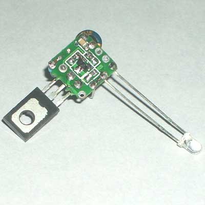 用户收到的货物会如左边本图所示,并会在三极管上配一个简易散热片(我们担心用户收到货后盲目通电烧坏三极管,所以免费加一个小散热片!如果用户将本模块应用到本站旋转LED套件,那么不需另配散热片!),其中长长伸出的是红外发射管,板上已经安装限流电阻,用户如果不将本模块用于本站旋转LED点阵套件,请自行拆除该红外发射管!用户批量购买可联系本站不要安装红外发射管,批量价格优惠!100支以上价格8元,量大更优!