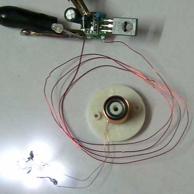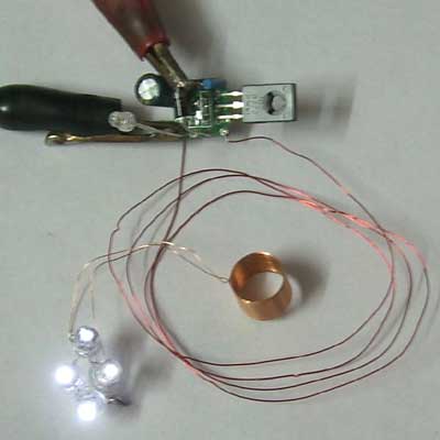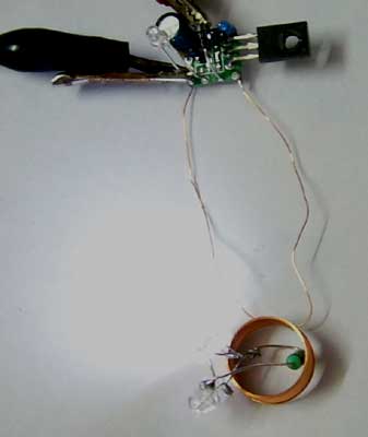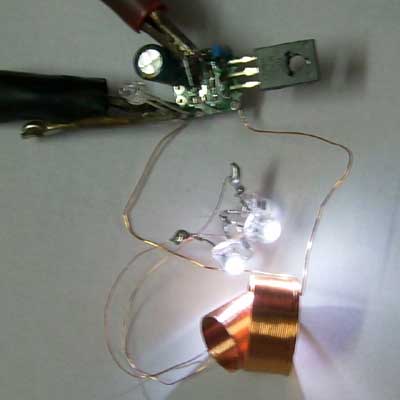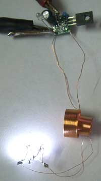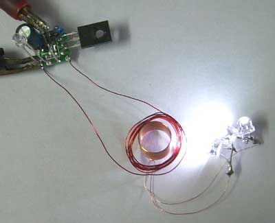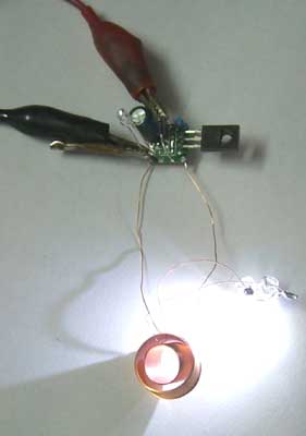 两个空心线圈套到一起了,发光二极管发出强有力的白光!请注意千万将电压调高,否则发光二极管可能会被烧坏的!如果用户的发光二极管烧坏了,欢迎再来本站购买,虽然本站售价偏贵,但该怎么算还是怎么算!
