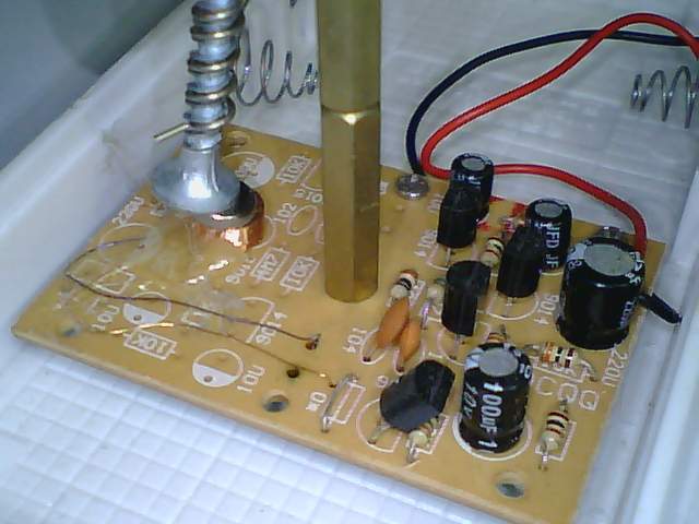 再水平放置电路板,必要时在电路板四角贴上四个2mm高的脚,让电路水平不要摇动,然后将电磁线圈固定在磁铁的正下方,这时,用手拨动磁铁支架,可以自由的转动做阻尼运动,这时,电路部分和机械部分都组装完毕。
