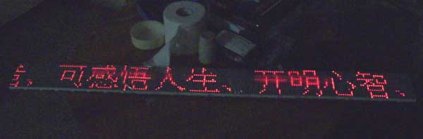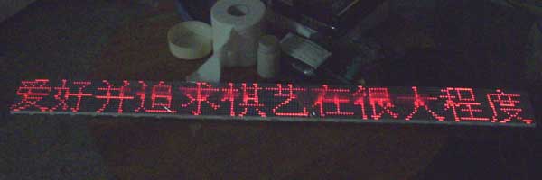 后面是3.75mm的四字主板带两块3.75mm四字副板的工作照片:(文字是滚动显示的,一个汉字需要占32字节ROM,1K只能存储32个汉字。如果采用STC89C51(ROM4K)芯片的话,滚动显示一句80个汉字的广告标语还是可以实现的。我们用STC89C58可以显示400字的广告内容了,用STC89C52的话,显示200字的广告是没有问题的。说明:用AT89C5x(S5x)也可以,但速度会慢一些,可以正常使用。
