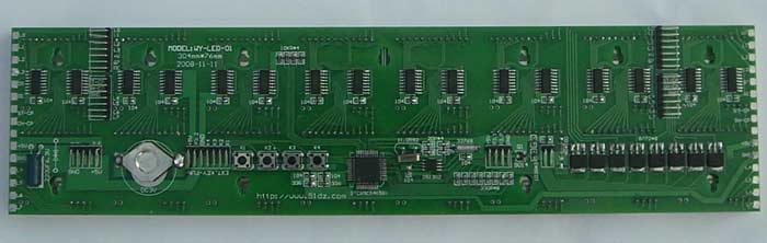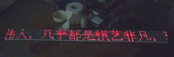 图中有浑浊红色的地方是因为用了封箱胶纸捆了一根透明的IC杆,用来固定板防止板在移动时背后焊接处断开。有字错开的现象是因为照片是照的滚动显示的某一个睡间。(照相机快门时间选择的是1/30秒,不能开闪光灯,否则,闪光灯太亮会看不到LED显示。)