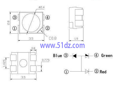 3528全彩RGB共阳 四脚 贴片LED灯珠 1210LED发光二极管  因为贴片元件小,方便本站工作及大家使用10个1.5元。10个一袋。