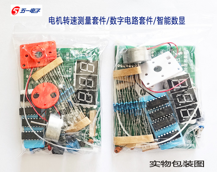 电机转速测量套件:现配有元件清单、原理图、双面玻纤PCB印刷电路板、所有元件和制作说明。本套件一般安装无误都是会一次性成功,全部配有IC插座,如果是IC有问题的话,方便更换使用。本站配的IC都批量试过才发货的,大家放心使用。本套件以数字电路为核心,通过光电开关传感器检测电机转动产生速度电信号,用数字电路进行计数,并采用数码管显示电机速度。