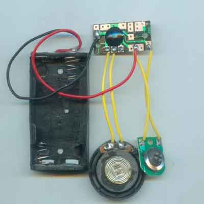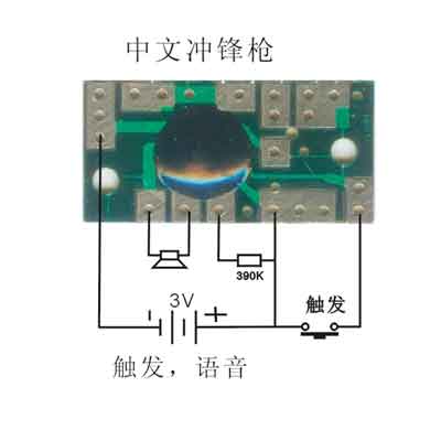 中文冲锋陷阵声,触发,规格:长29.2mm,宽14.2mm欢迎各位电子爱好者邮购、选购。只需花小小钱就可帮你的弟弟妹妹制作一个理想的玩具,同是也可以配合电子实验套件使用,品种很多。芯片里固化了一种语音,枪声、、、冲啊、、冲啊、、、卧倒、、、、!本站配套的电阻、喇叭、电池盒、导线都有,找不到也搜索关键字,搜索商品名就会跳出来。