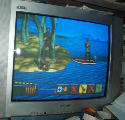 开始战斗了,大家看到我的枪对准了一个敌人,电视左下角是我的子弹,右边是机枪、死欧枪、导弹、火箭四种武器选择(我自己是这样理解的)。