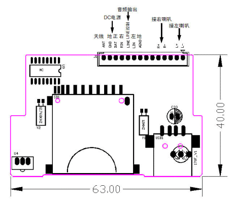 四、接线图与尺寸: (注:本模块没有收音,不用接天线)