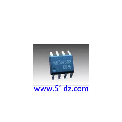贴片34063,SOP-8脚。 1. MC34063 DC/DC变换器控制电路简介: MC34063是一单片双极型线性集成电路,专用于直流-直流变换器控制部分.片内包含有温度补偿带隙基准源、一个占空比周期控制振荡器、驱动器和大电流输出开关,能输出1.5A的开关电流.它能使用最少的外接元件构成开关式升压变换器、降压式变换器和电源反向器. 特点: *能在3.0-40V的输入电压下工作 *短路电流限制 *低静态电流 *输出开关电流可达1.5A(无外接三极管) *输出电压可调 *工作振荡频率从100HZ到100KHZ 2.MC34063引脚图及原理框图  3 MC34063应用电路图: 3.1 MC34063大电流降压变换器电路