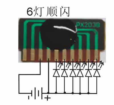 6灯顺闪多变化芯片,工厂生产多种玩具,利用这些芯片,品种多多,芯片里固化了不同的程序,给人也有不同的感应作用。