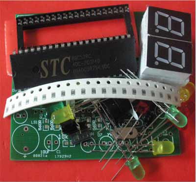 将R8~R17及2只共阳数码管焊好(注意不要焊反,数码管中有小数点的应为右下方),将2只电子开关三级管VT1、VT2焊上,再将40脚的集成电路插座焊上,这样这部分电路就制作完成了。接下来对这部分电路进行测试,接上电源,数码管全灭,用一导线的一端接地,另一端插在集成电路插座的28脚上,这时用万用表电压档测量VT1集电极电压,正常应为4.5V以上,若不正常,检查VT1是否焊反,R16是否虚焊等。用另一导线的一端与地线相连,另一端依次碰集成电路插座的32脚~39脚,一边碰一边查看数码管VD5,正常时可以看到每碰一个脚,对应一段数码管灯亮。若不亮,仔细查看与该脚相连的电阻及数码管是否虚焊。用同样的方法调试另外1只数码管VD6.