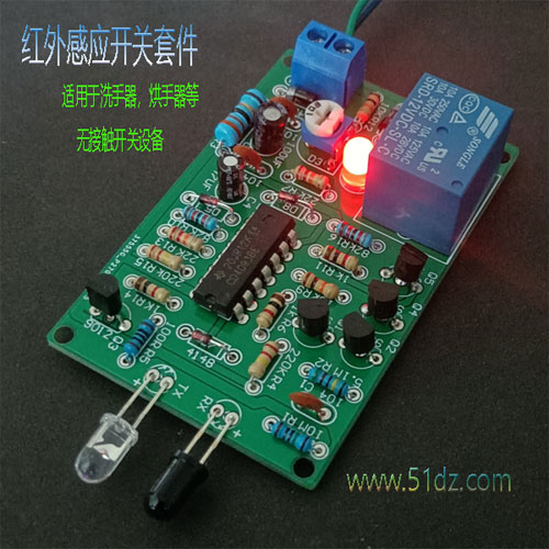 红外感应开关套件内部包含红外线发射、接收及信号放大与处理电路,能够以非接触的形式检测出前方一定范围内的人体或物体,并转换成高电平信号输出。由于红外线反射型传感器内部采用了低功耗器件和抗干扰电路,所以工作稳定可靠,性能优良,可广泛应用于各种自动检测,自动报警和自动控制等装置中。如:光电计数器,接近式照明开关,自动干手器,自控水龙头,感应门铃,倒车告警电路。