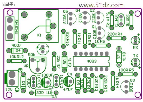 红外感应开关套件根据红外感应的情况,使继电器作出相应反应,以使负载启动或停止。红外感应开关套件主要由电源电路、红外发射电路、红外接收电路、继电器驱动电路组成。 红外发射电路由R4、R5、R6、R9、C2、D1、TX、U1B(CD4093)、Q3组成;红外接收电路由R1、R2、R3、C1、Q1、Q2、RX组成。C4、R11组成(动作)延时电路,延时的长短由电容和电阻的大小决定。R12、Q4组成继电器驱动电路。C3、R8用于调整电路动作响应灵敏度,电容短时间的充放电既稳定电平信号,也起到干扰的作用。接通220V的交流电后,经电容器降压得到所需要的12V电压,也可以直接用外接电源提供12V的直流电,(调试过程中最好利用外接电源提供12V的直流电以防触电)。经外发射管TX发射红外线,若经外接收电路接收不到红外信号,U1A的1脚由于R3的下拉作用保持低电平,无论U1A的2脚电平为高或为低,U1A的3脚得到的信号都是高电平,经R7到D2,由于二极管的单向导电性,U1D的11脚、12脚保持高电平,U1D的13脚为低电平不变,信号经R10到D3,同理,由于二极管的单向导电性,U1C的8脚、9脚保持低电平不变,U1C的10脚为高电平不变,三极管Q4截止,继电器不动作。