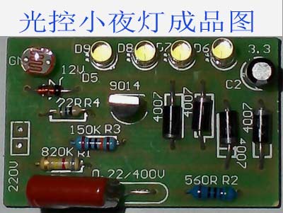 功能: 工作电压:220V,光控LED小夜灯,通过光敏电阻感应环境光线的强弱来控制LED的发光强度,实现白天自动关闭,夜晚自动打开的功能。