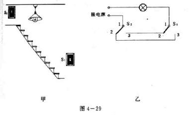 在楼梯(或楼道)中间安装的电灯,需要在楼梯的上、下两头都能控制它(图4-29甲)当上楼梯时,能用下面的开关S1开灯,人上了楼梯以后,能用上面的开关S2关灯;当下楼梯时,能用S2开灯,用S1关灯。图4-29乙是用两个单刀双掷开关控制一盏灯的电路图。单刀双掷开关的掷刀可以绕轴1转动,或者跟触头2接触或者跟触头3接触。分析一下S1、S2中的任何一个都能开灯、关灯的道理按照图4-29乙所示的电路图,在木板上用电池、小灯泡、两个单刀双掷开关组成电路,并且试验这个电路中的两个开关是不是都能开灯、关灯。如果没有单刀双掷开关,可以采取代替的办法,例如在木板上接三个圈钉分别代替轴1和触头2、3,用一段铜线代替掷万,接在1、2间,或置接在1、3间。